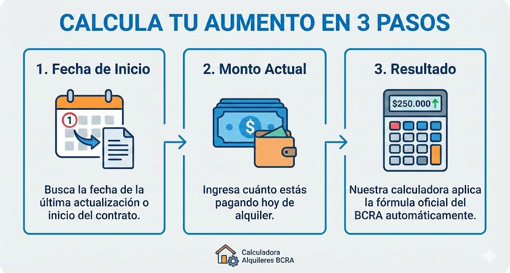La Calculadora de Alquileres BCRA es fácil de usar. Solo debes ingresar tres valores básicos (alquiler actual, porcentaje de ICL y período de ajuste), y la herramienta hace el resto del trabajo por ti. El resultado es instantáneo y te muestra el nuevo alquiler ajustado y el aumento total.