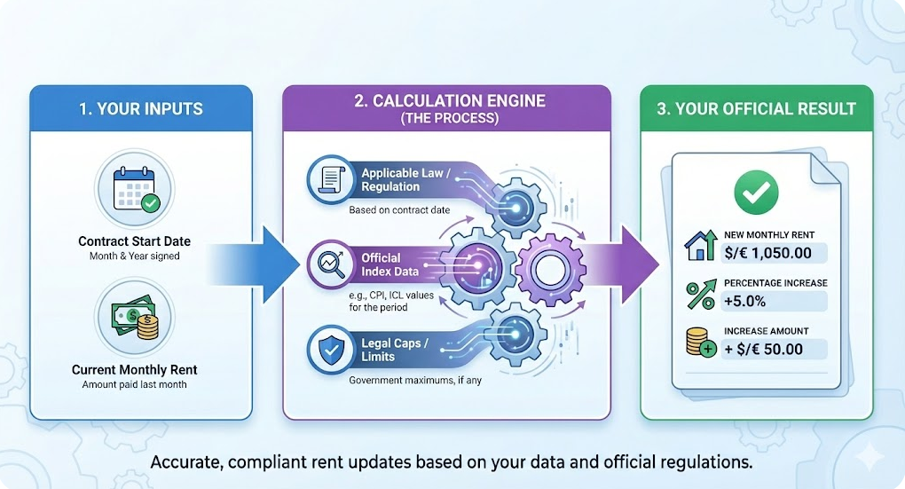 4. Aplicás la variación al monto base según la fórmula pactada. (Ejemplo sencillo: nuevo alquiler = monto base × (índice al final / índice al inicio)).