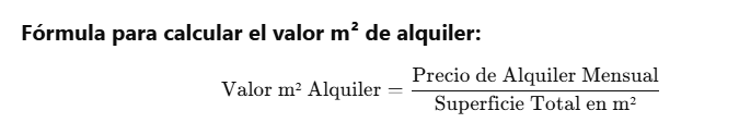 El valor m² de alquiler se calcula con la fórmula: Valor m² Alquiler=Precio de Alquiler MensualSuperficie Total en m²\text{Valor m² Alquiler} = \frac{\text{Precio de Alquiler Mensual}}{\text{Superficie Total en m²}}